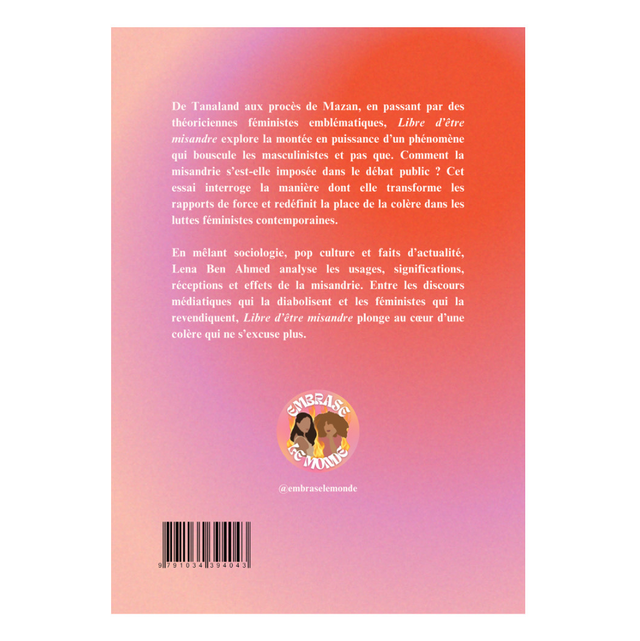 En mêlant sociologie, pop culture et faits d’actualité, Lena Ben Ahmed analyse les usages, significations, réceptions et effets de la misandrie. Entre les discours médiatiques qui la diabolisent et les féministes qui la revendiquent, Libre d’être misandre plonge au cœur d’une colère qui ne s’excuse plus.